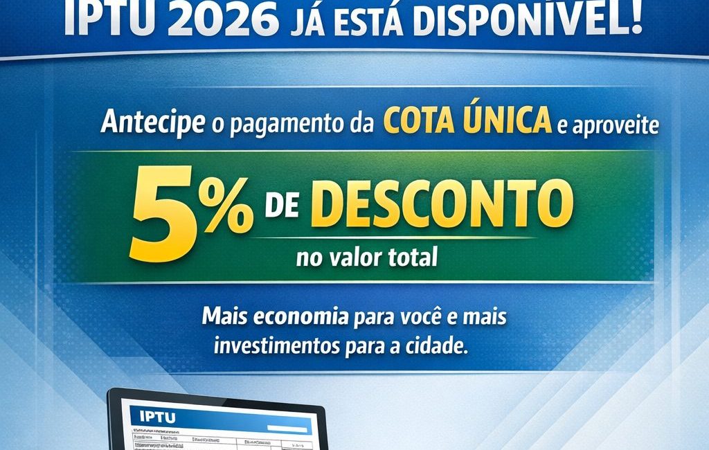A Prefeitura Municipal de Careaçu informa que o IPTU 2026 já pode ser acessado pelos contribuintes. Quem optar pelo pagamento antecipado da cota única garante 5% de desconto no valor total, uma oportunidade para economizar e manter suas obrigações em dia.