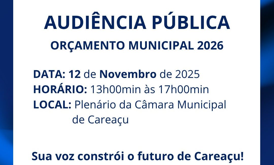Sua voz é fundamental na construção do futuro de Careaçu! A Prefeitura Municipal de Careaçu convoca a população em geral, entidades civis, associações e sindicatos para participar da Audiência Pública destinada a debater sobre o orçamento público do município para o ano de 2026.
